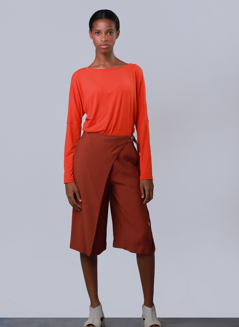 A Bermuda Martine Marrom é a escolha ideal para quem busca uma peça de impacto com sobriedade. Sua construção inteligente apresenta uma aba frontal que se prende na lateral oposta através de botões, oferecendo uma camada extra de design à modelagem de perna ampla. É uma peça que transita facilmente entre o ambiente de trabalho e eventos sociais, sempre com um toque de modernidade.