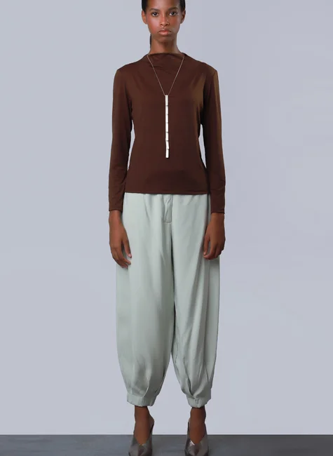 A Calça Lux Verde Sálvia traz a leveza da cor tendência para uma modelagem de impacto. O efeito balonê é construído de forma fluida, culminando em uma barra ajustada por pences que criam um detalhe visual rico e moderno. O cós com elástico proporciona praticidade no vestir, tornando-a uma peça essencial para quem valoriza o design autoral sem abrir mão do bem-estar.