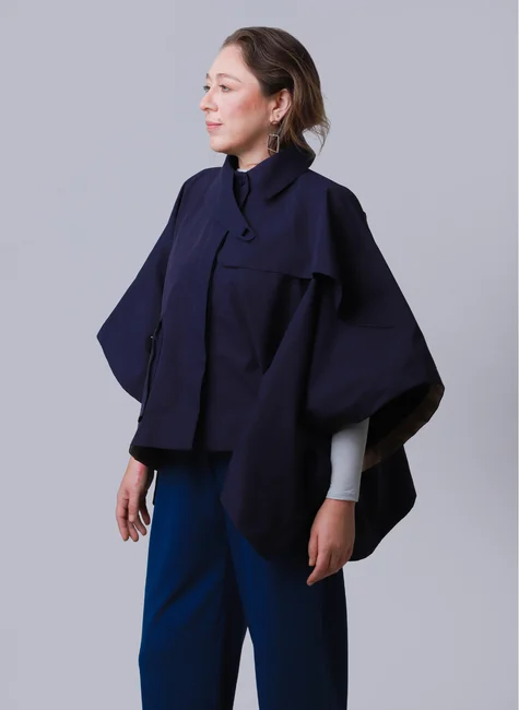 O Tab Cape Azul Marinho redefine o conceito de moda funcional. Unindo a estética moderna e geométrica à alta performance, este casaco estilo poncho é confeccionado em tecido tecnológico impermeável, ideal para os dias de chuva sem abrir mão da elegância. Sua construção em formato quadrado proporciona um caimento estruturado e contemporâneo, enquanto o contraste do revel em bege adiciona um toque refinado ao design. O grande destaque fica para a gola arquitetônica que, ao ser fechada, cria uma sobreposição impecável com fechamento oculto.
