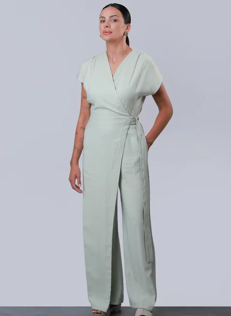 O Macacão Bari Verde Sálvia une uma tonalidade tendência à funcionalidade do modelo envelope. Sua modelagem fluida é complementada pelo detalhe de transpasse frontal que se fixa lateralmente, criando um drapeado suave na cintura. Ideal para quem busca uma cor diferenciada com o caimento impecável da manga japonesa e a praticidade do elástico posterior.